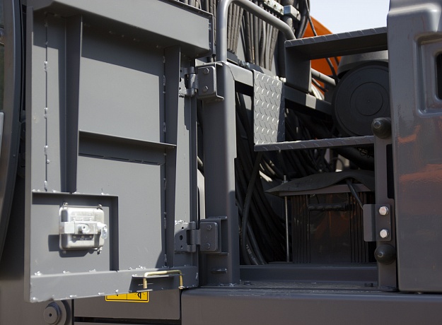 - Защитным съемным люком (расположенным снизу гусеничной рамы) центрального колодца гусеничной рамы, обеспечивающим защиту коллектора, зубчатого венца опорно-поворотного круга и гидравлических коммуникаций от попадания строительного мусора и грязи.