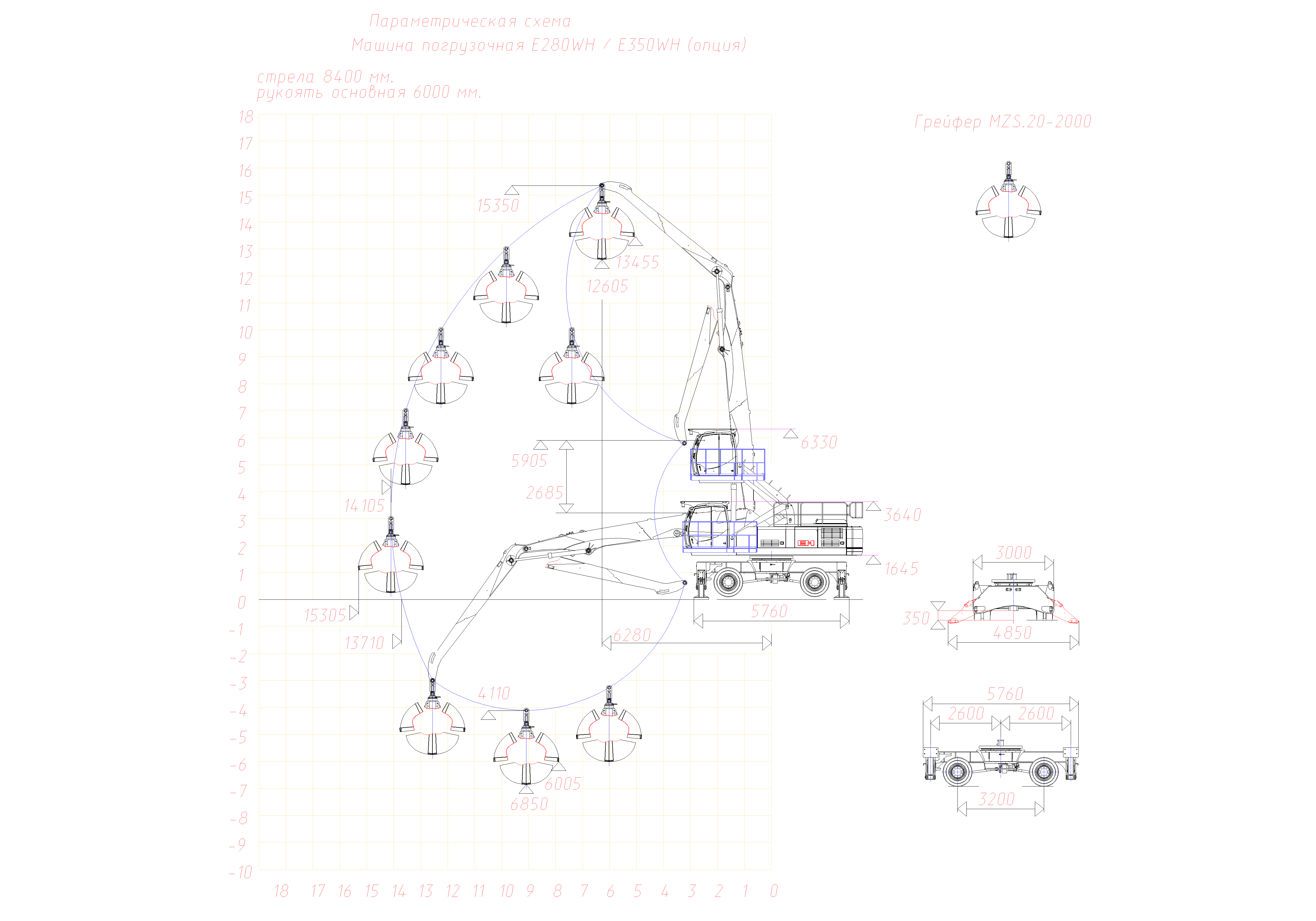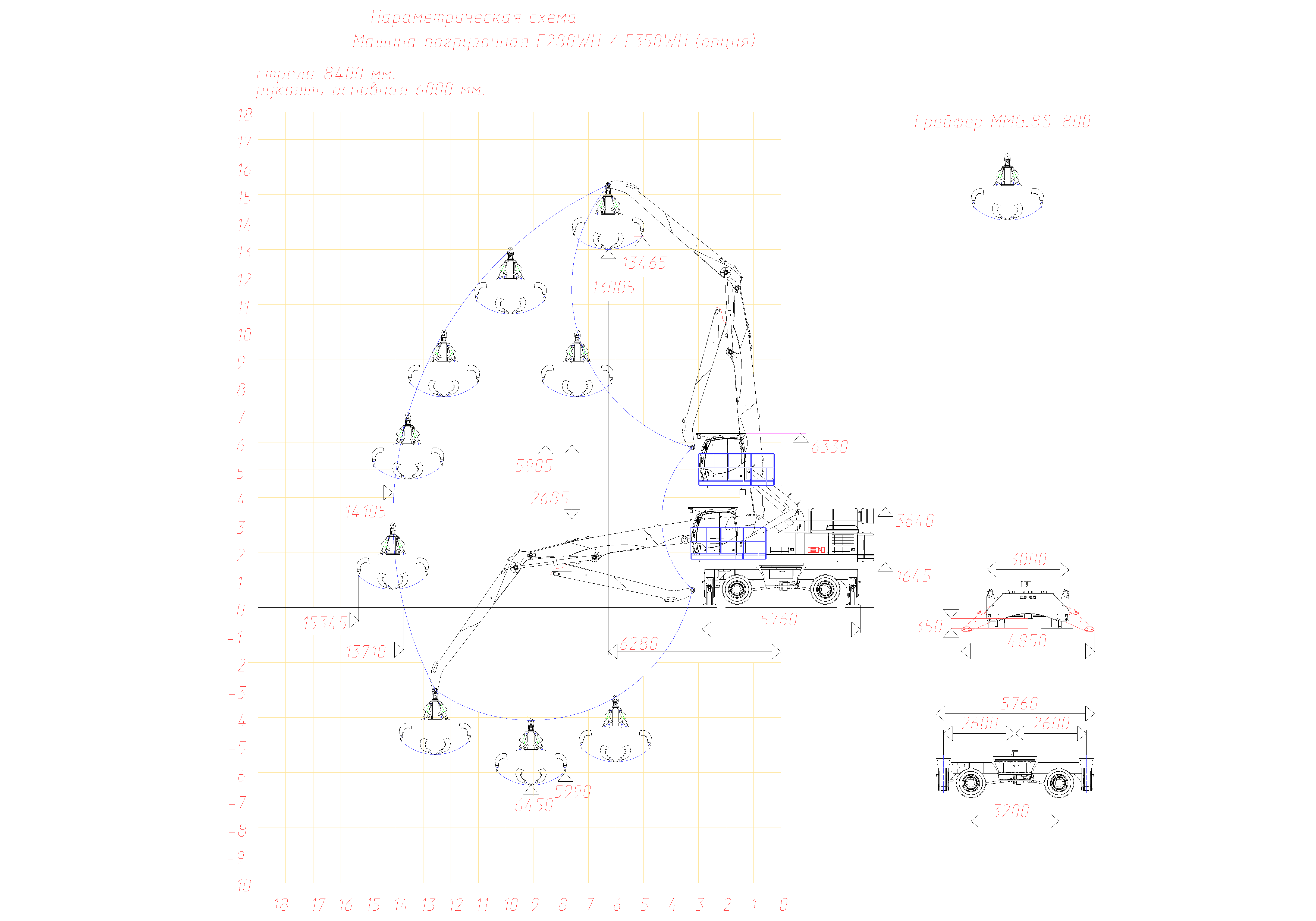 Дорожное положение с разными рукоятями (рабочее оборудование лежит на уровне земли) м 6,0