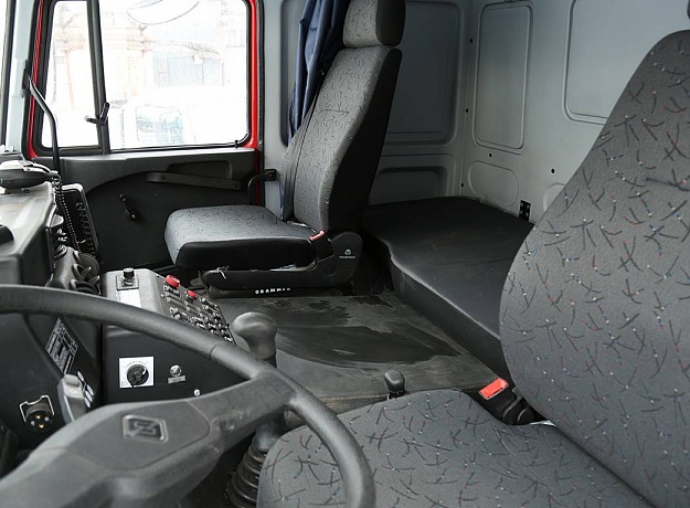 - На шасси установлена кабина водителя повышенной комфортности с удобными сиденьями для 2-х человек, откидным спальным местом эффективной системой вентиляции и отопления , хорошим обзором и информативной панелью приборов.