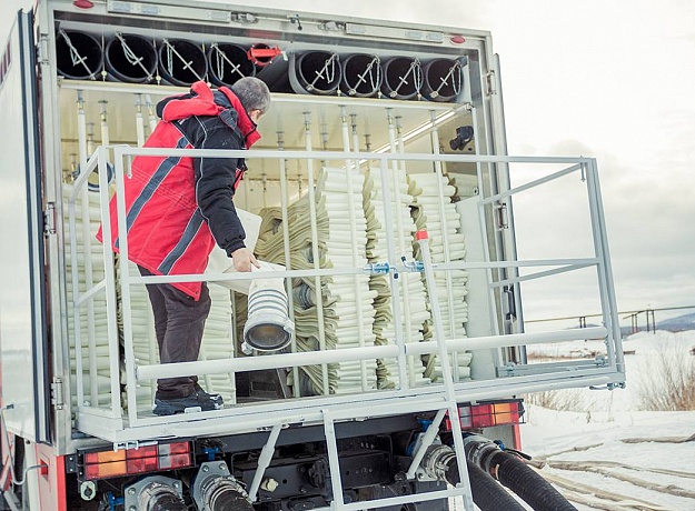 - Имеется устройство со встроенным электроприводом для смотки напорных рукавов после работы на пожаре.